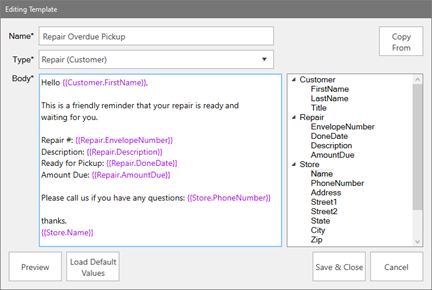 For example, if you are creating a repair overdue pickup reminder, you might make a template with this text: