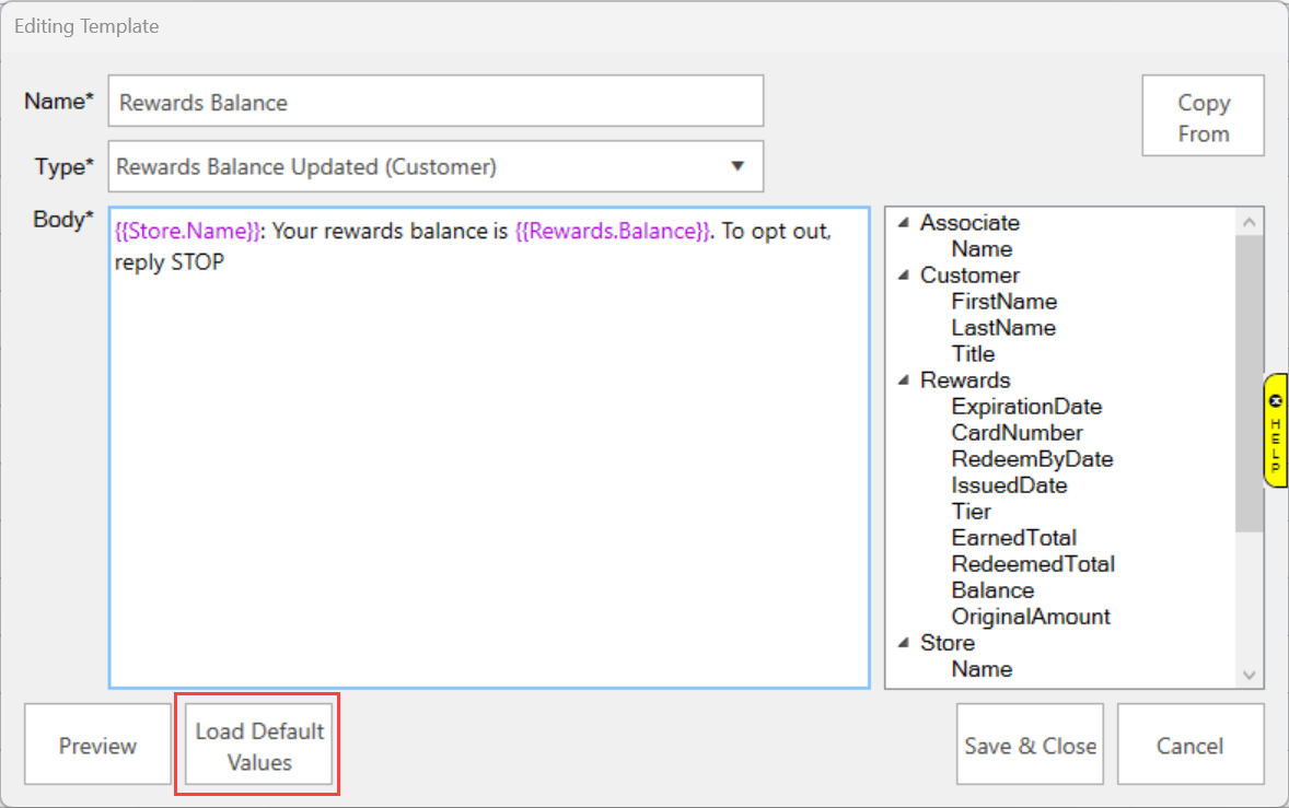 4. Click Load Default Values to load the default template or use available merge fields to create a custom template.