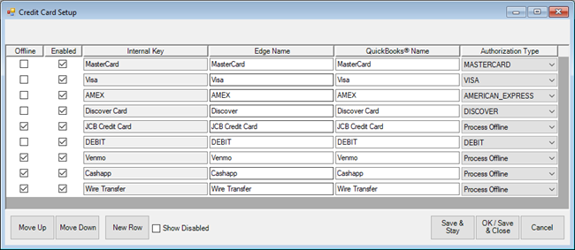 This is where you define each credit card you accept. You can also define alternate forms of payment here, such as Venmo and Cashapp. Payment types defined here can be individually reported on using the Tender Detail reports .