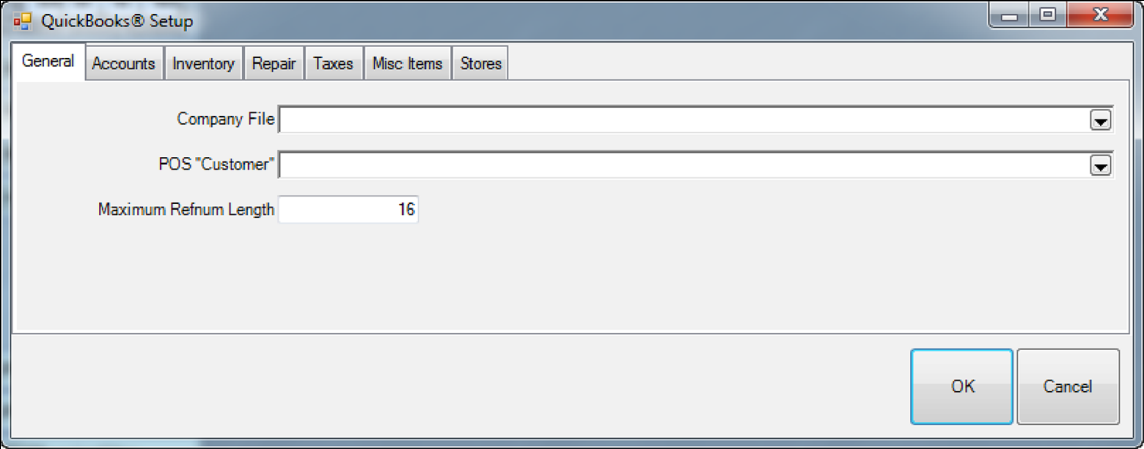 Select Administrative > QuickBooks > Set Up QuickBooks Integration. The QuickBooks Setup screen will appear with the General tab selected.