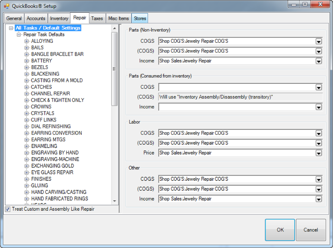 The Repair tab controls how repair, custom, and assembled items are posted to QuickBooks.
