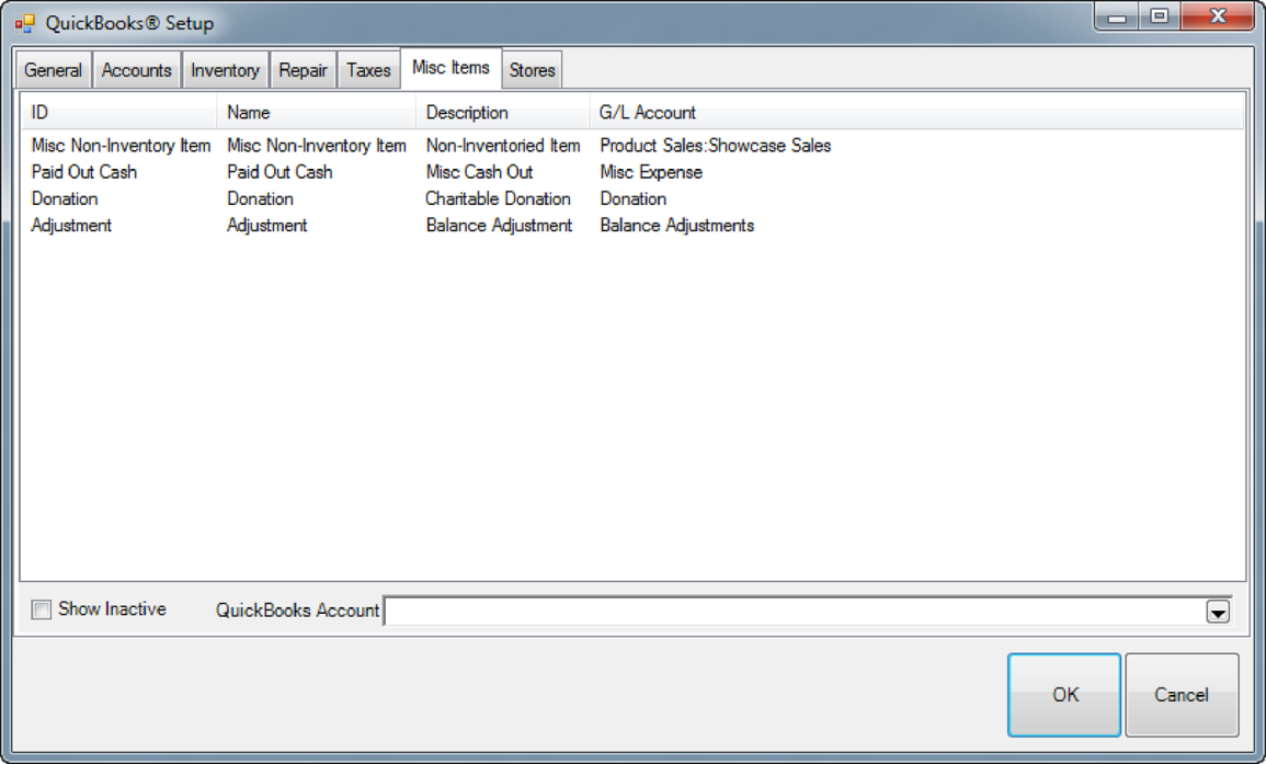 The Misc Items tab is used to associate each of your miscellaneous sales line definitions to a QuickBooks account. Whenever you “sell” a miscellaneous sale line, the amount is posted to the corresponding G/L account, and an offsetting amount is posted to accounts receivable. Any tender is then in turn posted against the accounts receivable.