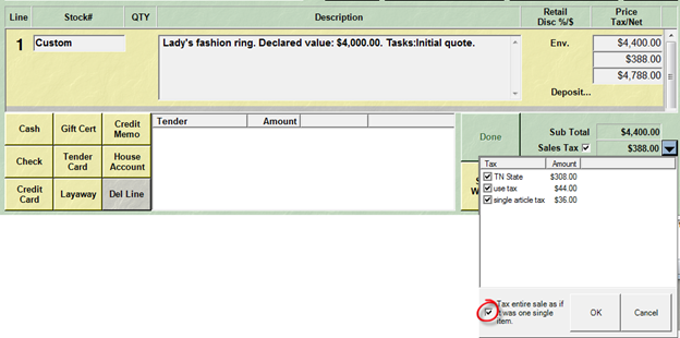 When processing a custom job transaction, you must click the drop-down arrow next to Sales Tax and check the Tax entire sale as if it was one single item checkbox.
