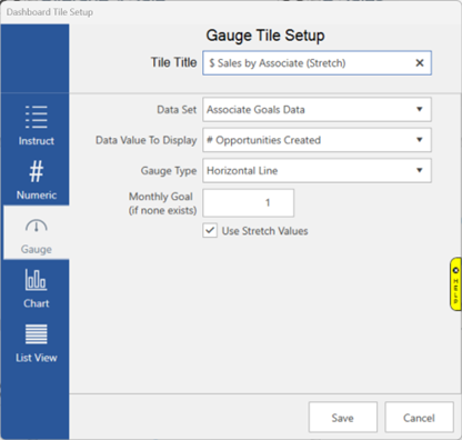 When checking the box for Use Stretch Values, you will notice the Tile Title will automatically add “(Stretch)” to the end of your title. This is done to prevent confusion on whether the tile is displaying an Associate Goal or an Associate Stretch Goal.