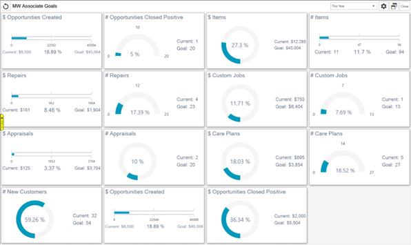 In addition to available reports, you and your associates can track their Goals using the Dashboard feature. Setting up Dashboards for Goals works just like any other Dashboard tile setup.