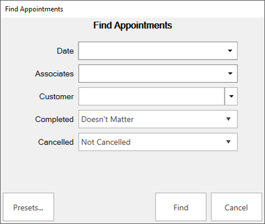 - Click Associates > Appointments > Find. The Find Appointments window will appear.