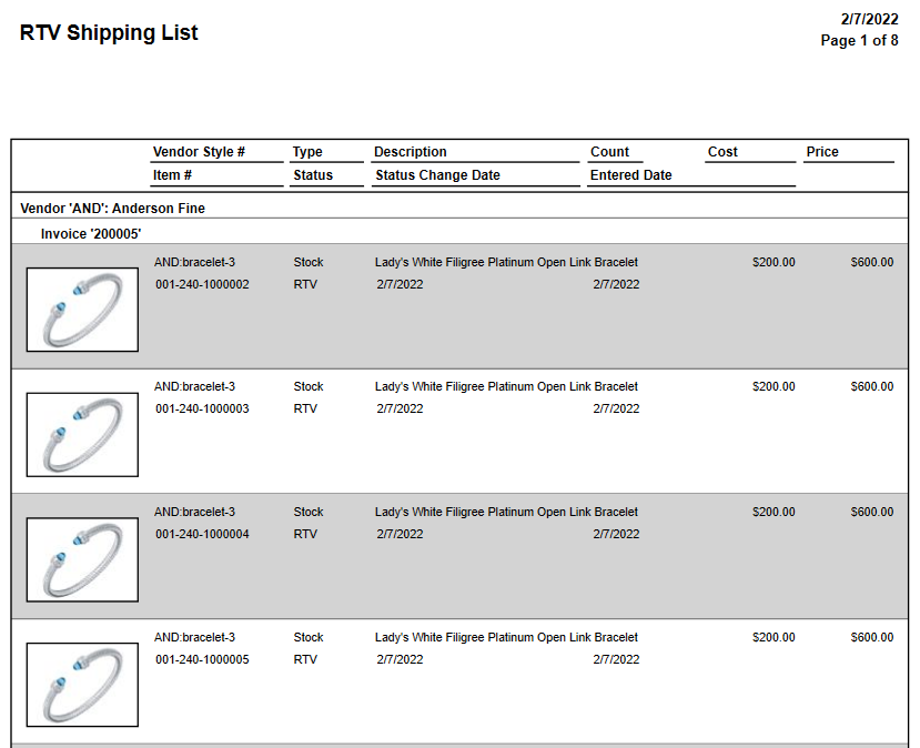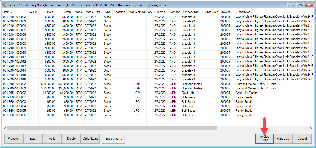 This Invoice Print feature lets you print items by invoice directly from the item list screen by clicking the Invoice Print button. This feature can be helpful for tasks such as quickly creating packing slips for RTV’d items.