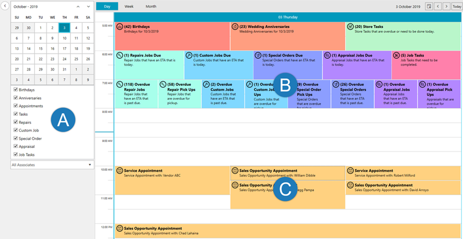 These checkboxes toggle which occasions, services, and tasks to display. The drop-down allows you to filter these records by associate. You can select a specific associate, see all associates, or only see records not assigned to any associate.