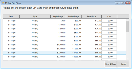 The cost to you from JMIC for the coverage. This is set by arrangement between you and JMIC. The data is not automatically populated; you must enter the costs here. This data must be entered to have correct sale line data written to the database and for accurate sales reporting.