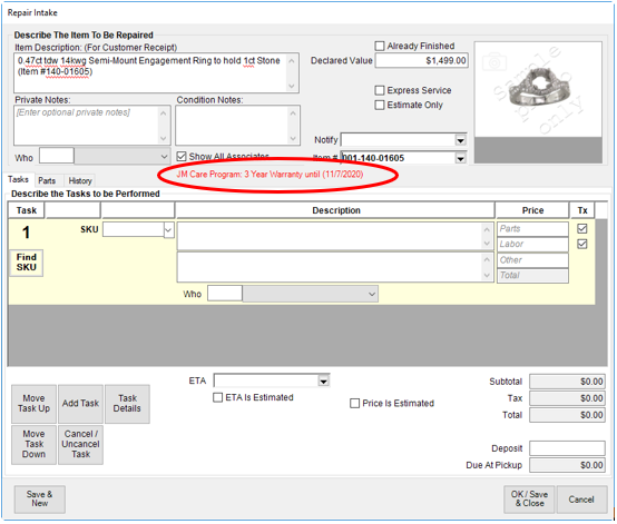 - Complete the repair intake as usual. Notice that costs to the customer are all 0.