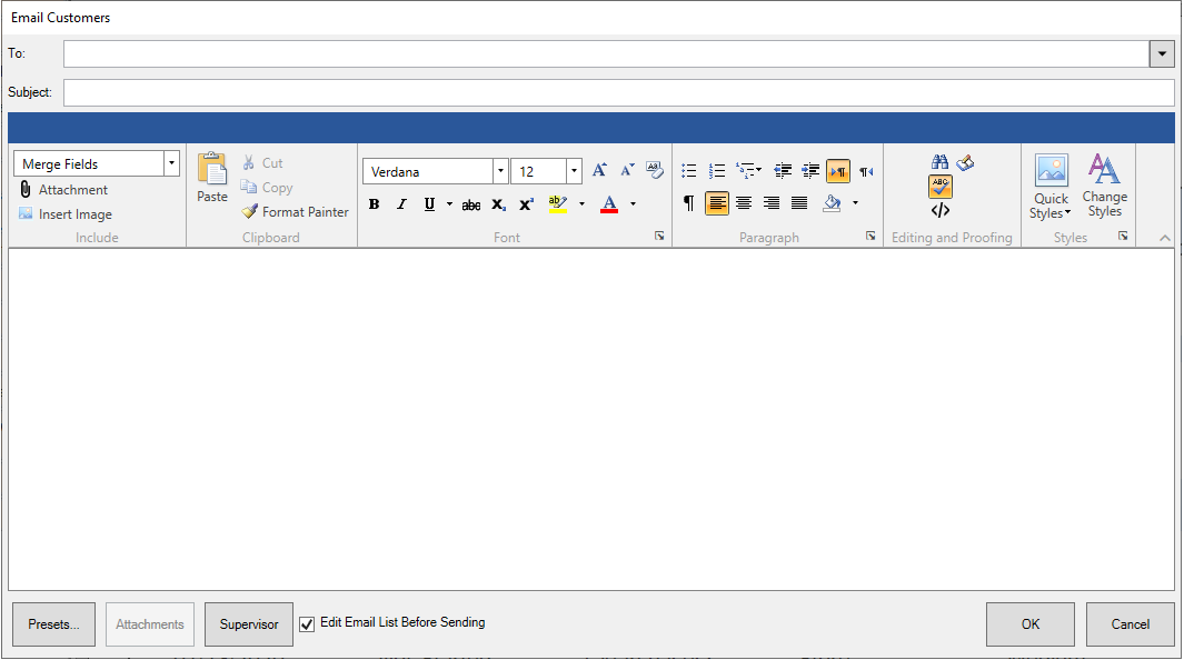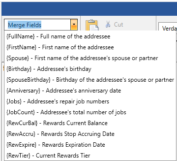 - Use the Merge Fields drop-down at the top to insert variables that will behave like a mail merge when you send the email. The Edge will pull this data from the customer record and populate the email body.