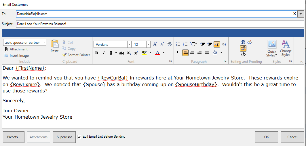 Write the contents of the email, inserting merge fields where needed. An example might appear as follows.