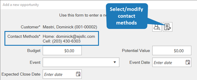 - After identifying the customer, the default preferred Contact Methods will appear. The button in the top right will change to Customer Contacts – use this to select and edit how this customer should be contacted for this opportunity.