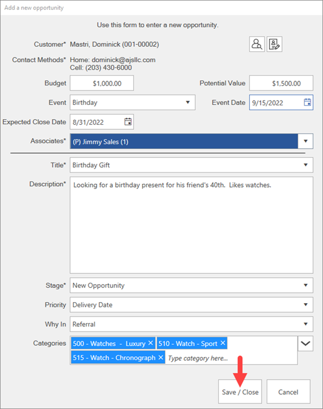 What date is the event? Note that the customer’s birthday, spouse’s birthday, and anniversary dates can be automatically filled in from the customer’s record.