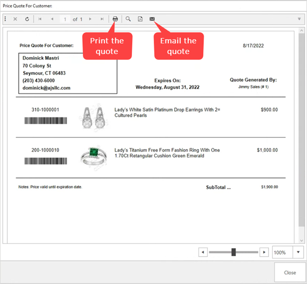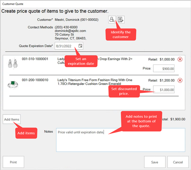 - Each quote requires a customer, expiration date, and one or more items.