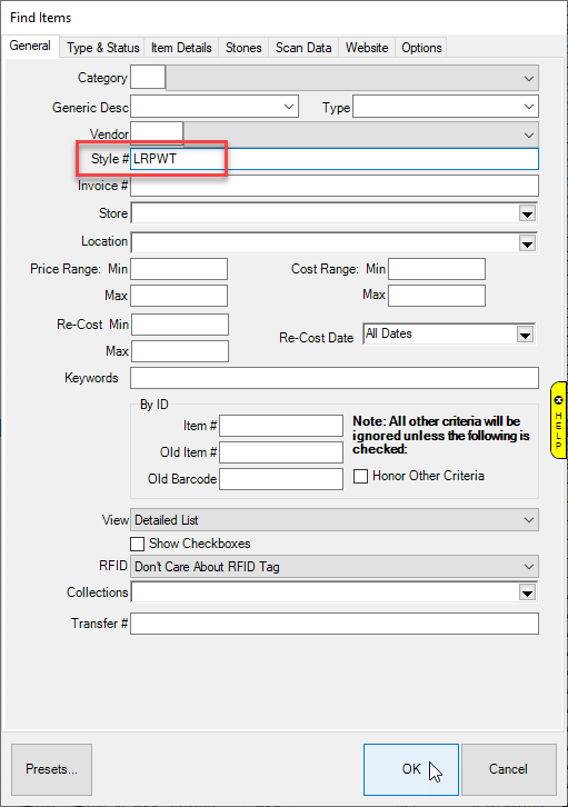 - To verify your bulk items by Vendor Style #, enter the style number into the Style # field found on the General tab of the Find Items filter: