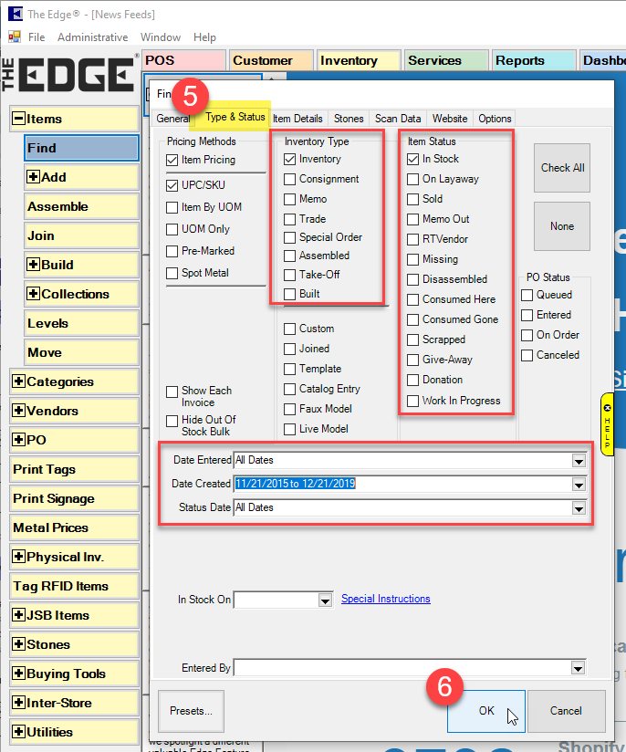 - We recommend starting with an in-stock item. To specify alternate statuses, stock types, and date ranges as needed, select the Type & Status tab on the item filter.