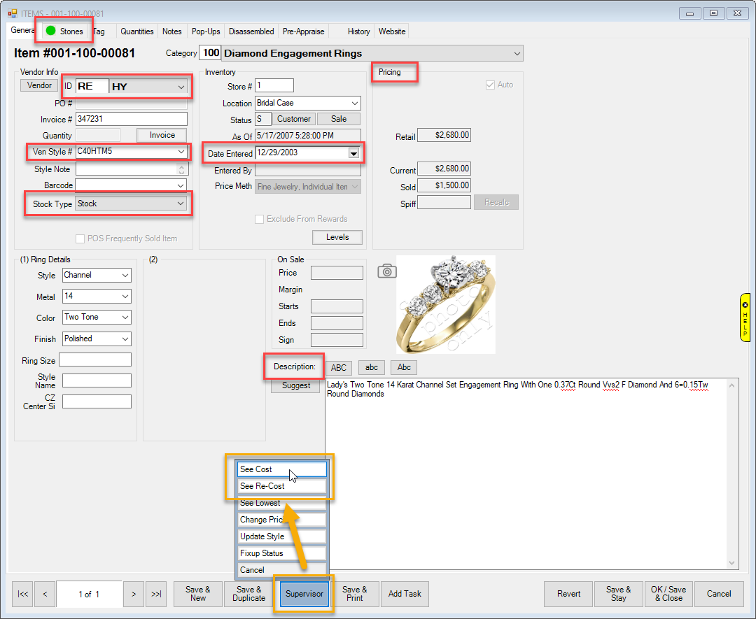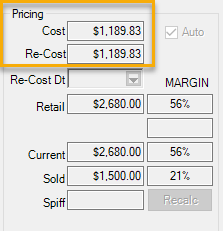 Example of how Pricing changes with the options See Cost and See Re-Cost selected from the Supervisor menu