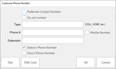 - Find and edit the customer. On the General tab, click the +Phone button. The Customer Phone Number window will appear.