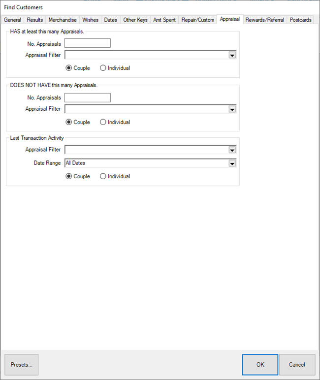 Opens the Appraisal filter allowing you to include customers based on Appraisal criteria |