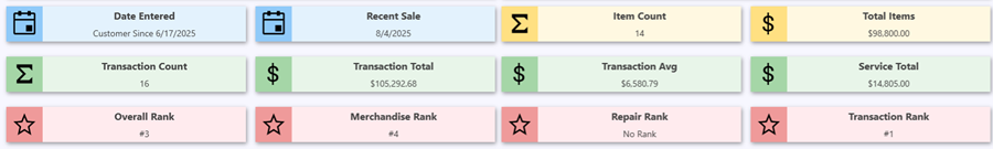 Customer Rankings provide an easy way to see a customer’s standing with your store. Key statistics are displayed, and metrics provided. These appear on the bottom of the General tab of the Customer Display.