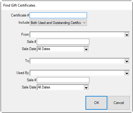 - Select Gift Certs > Find from the Customer menu. The Find Gift Certificates window will appear.