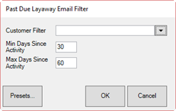 - Select Customer > Email Layaway Inactivity. The Past Due Layaway Email Filter will appear.