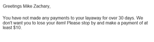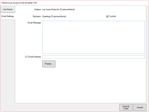 You may notice that customers are putting things on layaway and not following up. Using the Layaway Email feature, you can locate layaways that are inactive and remind customers about them.