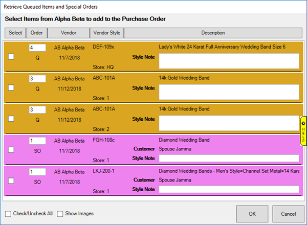 - Select the queued items you wish to place on this PO and click OK.