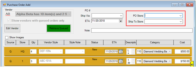 - Optionally, assign this PO to a store using the PO Store drop-down in the top right. The Ship to Store drop-down will default to the same store as PO Store, but can be changed. If no PO is specified, this PO will be ‘Unassigned.’ POs do not have to be assigned to stores.