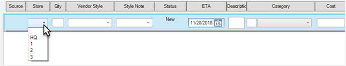 - Use the Add Line button to create additional PO lines to order items that were not previously queued. Each PO line contains a drop-down allowing you to assign it to a store. This is not required and, even if set, can be overridden when you use Receive Invoice to add these items.
