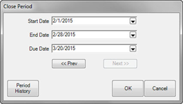 - From the Customer menu, select Statements > Print or Statements > Close. The Close Period window will appear.