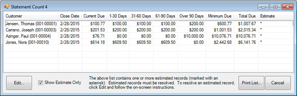 Shown is a list of customers who have a balance and for whom The Edge has estimated the aging for each balance. In this case, The Edge runs the Statement Find with filters set for first-time aging. In the future, when you use the Statement Find feature, you will be offered filtering options. For more information, see the section entitled Finding and Editing.