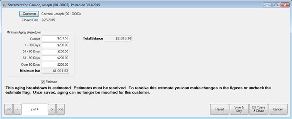 - Make changes to the statement record and save. Amounts shown under the Aging Breakdown should add up to equal the Minimum Due. If you agree with the aging shown, uncheck the Estimate option.