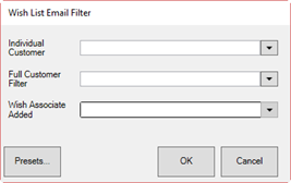 c. By associate. Use the Associate drop-down from the Wish List Email Filter to select the associates whose customers’ wishes you want to send. The Wish Lists to be emailed window will open. It works just like the results using several customers. Make your selections.