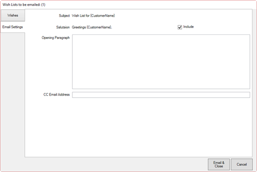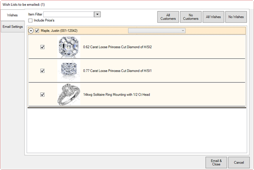 Use the down arrow next to the customer’s name to see his or her wishes. By default, the customer’s wishes will be checked. Use the checkboxes, All Wishes or No Wishes to determine what wishes should be emailed.