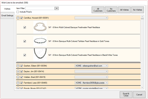 Using the down arrows next to each customer’s name, you can see his or her specific wishes. By default, all customers and all wishes will be checked. Use the checkboxes, All Customers, No Customers, All Wishes, and No Wishes to specify which emails to send.