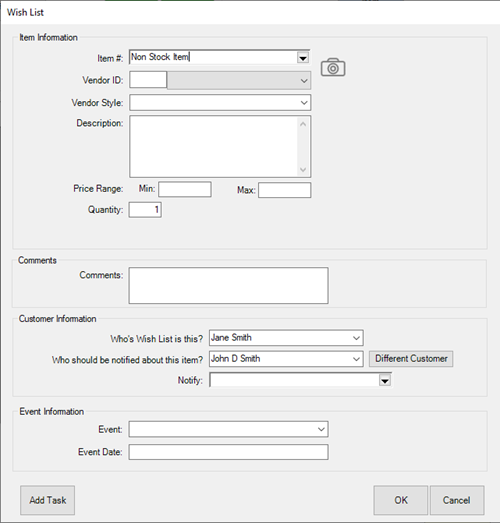 - Complete the fields as desired and select OK. The item will be added to the customer’s wish list.
