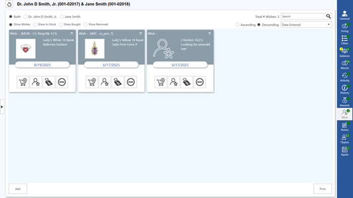 Wishes can be searched, edited, and removed from the customer record accessible from the main menu.