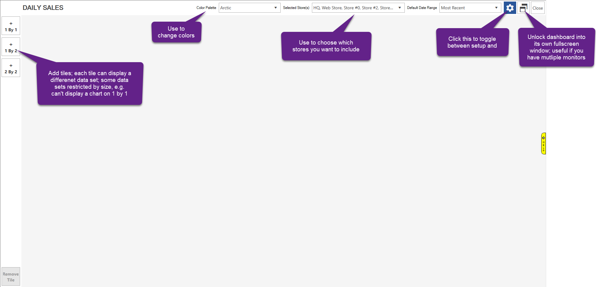 Note: In a multi-store environment, if you setup the Dashboard to view All Stores' data, you can later on select specific stores to view just their data. If you setup the Dashboard as a specific store, you will only be able to view that one store.