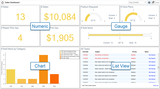 Dashboards allow you to put pertinent data at your fingertips in an intuitive, graphical display. Each Dashboard consists of one or more tiles and each tile can be setup to display different data. The data displayed can be based on specific associates or all associates.