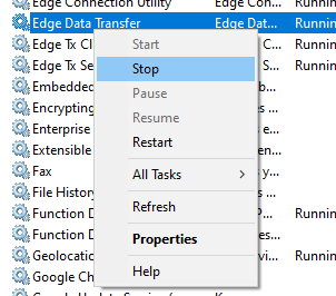 - Find EdgeDataTransfer in the list, then right click on it and select Stop.