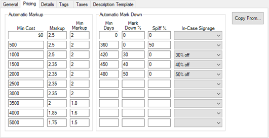 - Whether you use automatic markup or not, you should set the Min Cost ranges. These define how your inventory is segmented on the ordering and performance reports.
