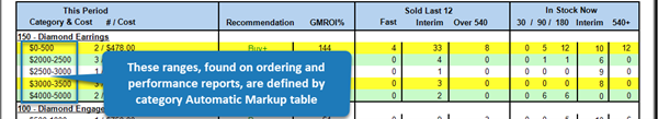 This table defines suggested retail for items entered into this category based on cost ranges. These cost ranges are also used to segment your inventory for analysis on the performance reports.