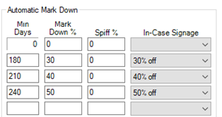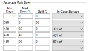 This table defines the mark down, spiff, and signage applied based on the item’s age.