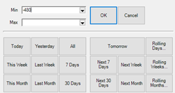 - Click the Item Filter drop-down at the top, click on the Type & Status tab, and click the drop-down next to Date Entered. Enter -480 into Min and leave Max blank, then click OK.