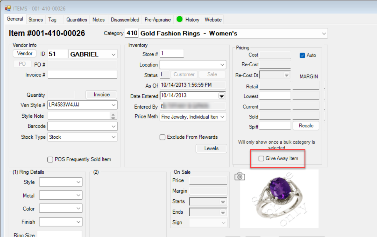 - On the item’s General tab, locate the Giveaway Item checkbox under the Pricing section and check the box.