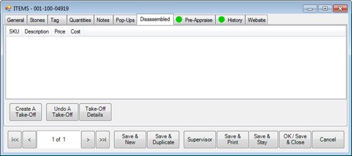 For example, if you were disassembling a ring with a single diamond mounted, you would create two take-offs: one for the diamond and one for the ring mount.  You can create as many take-offs as necessary to completely account for the disassembly of an item.  The full details of the original piece you are disassembling will be automatically copied into this New Item window.