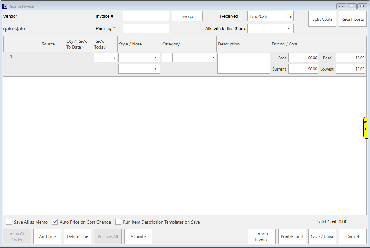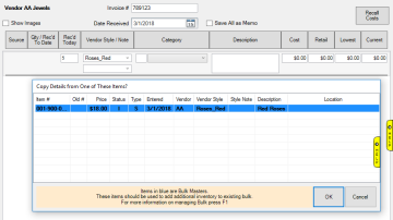 - Click the Bulk Master (highlighted blue) and click OK. The Cost and Retail will prefill. You can update these if necessary.
