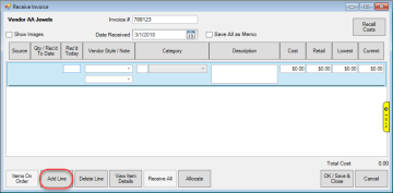 - The Receive Invoice window will appear. Enter the Invoice # at the top, then click Add Line at the bottom.